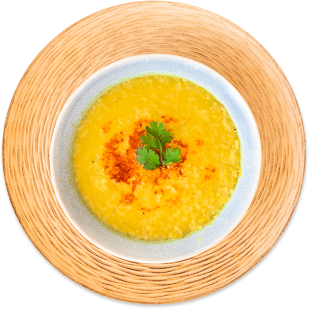 Mungo šošovica kombinovaná s kurkumou a ryžou, podavané s cesnakovým olejom. s maslom Ghee na požiadanie 7 / 450g